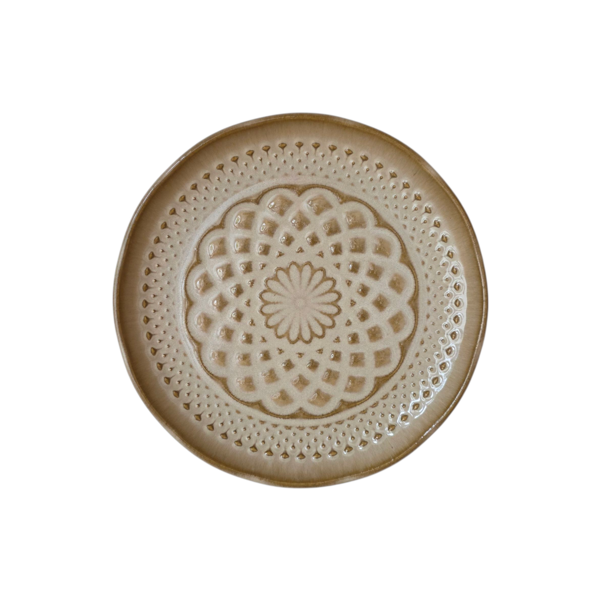 Dit prachtige bordje van het Portugese merk Vianagrés combineert ambachtelijk vakmanschap met tijdloos design. Met zijn subtiele beige tint en verfijnd reliëfpatroon is het een bordje dat rust en warmte toevoegt aan elke tafel.
