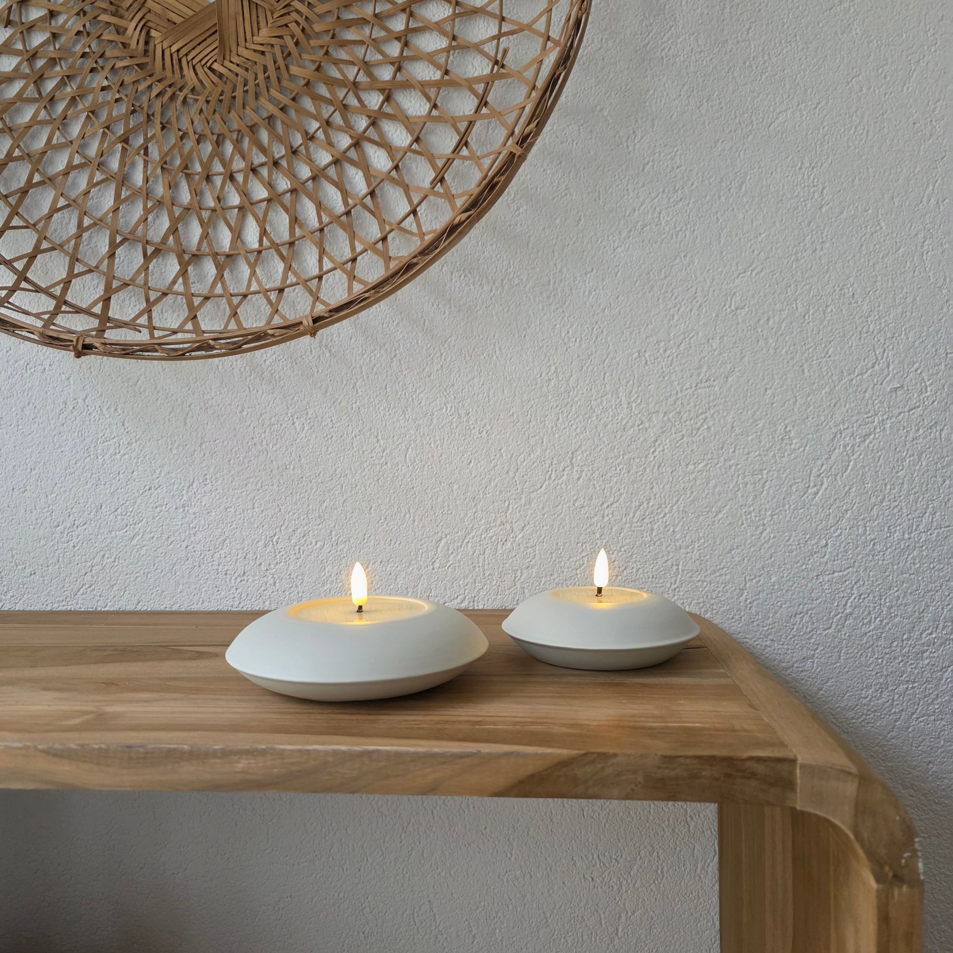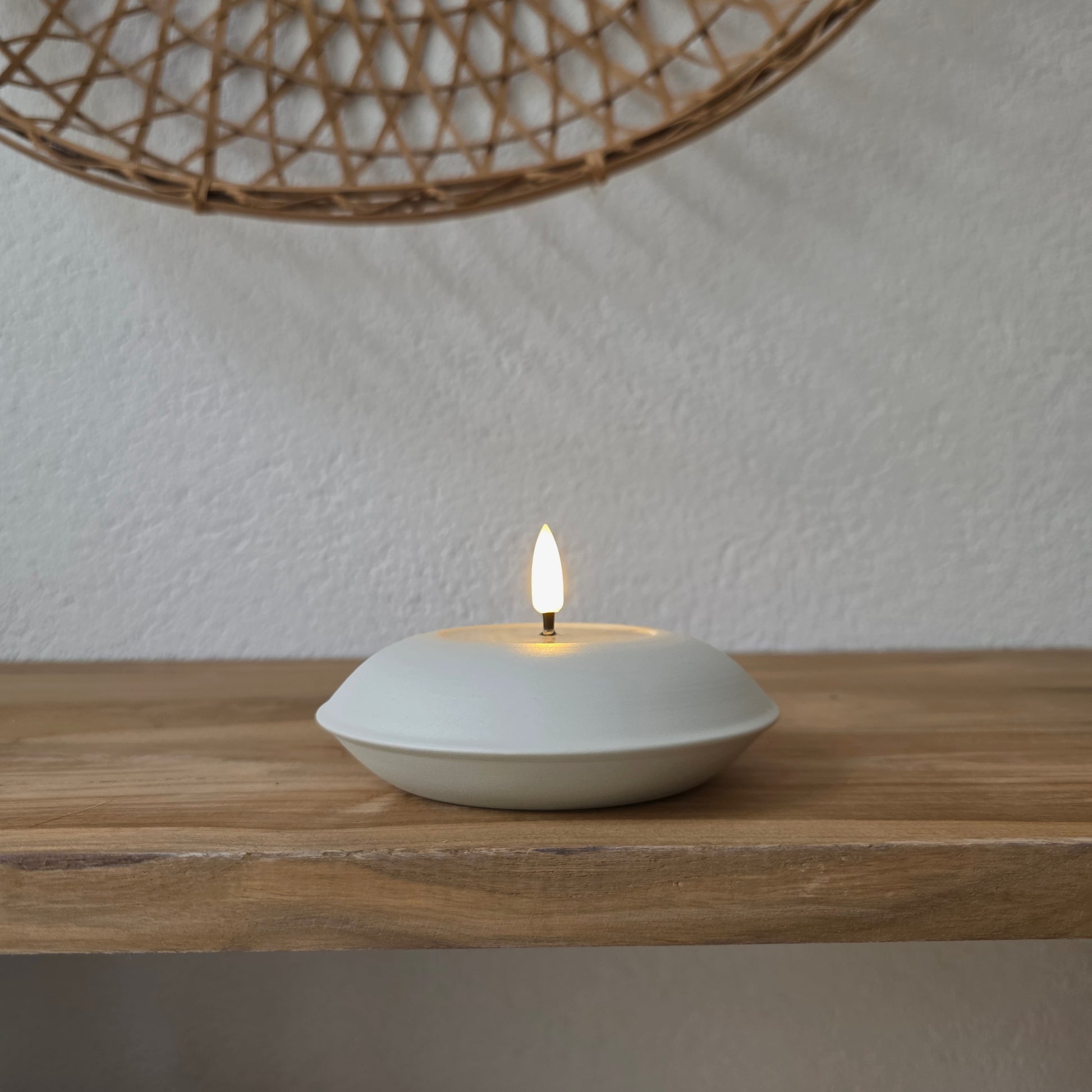 De LED kaars Puck is een subtiel en tijdloos accessoire dat in elk interieur past. Met zijn ronde, lage vorm en zachte crème kleur straalt hij rust en eenvoud uit. Het flikkerende vlammetje lijkt net echt, waardoor je de warmte en gezelligheid van een kaars ervaart – maar dan zonder vuur of rook.