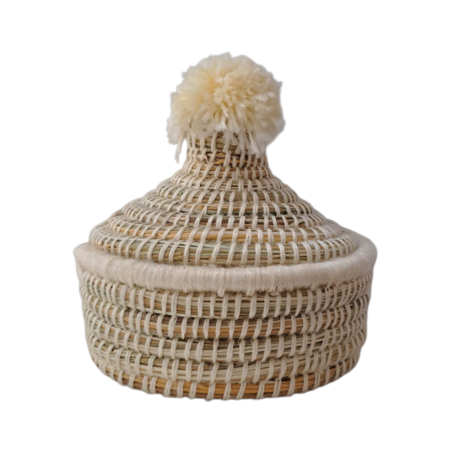 Hoe leuk is dit mandje? Hand gevlochten in Berberstijl en afgewerkt met een vrolijke pompon op het deksel – dit is opbergen, maar dan in stijl.