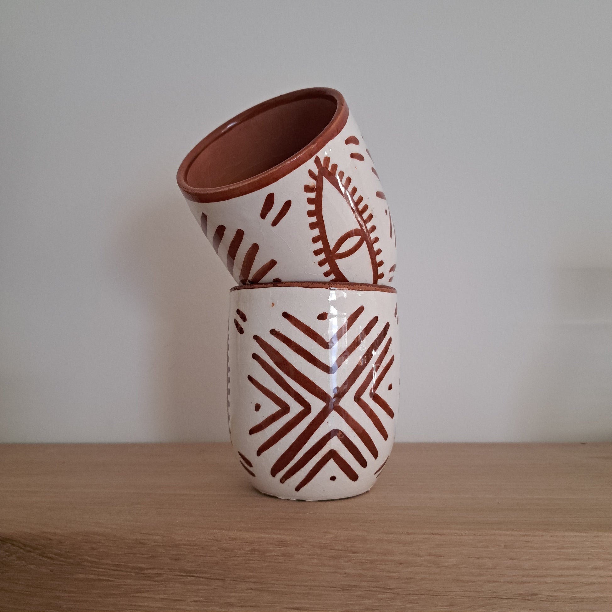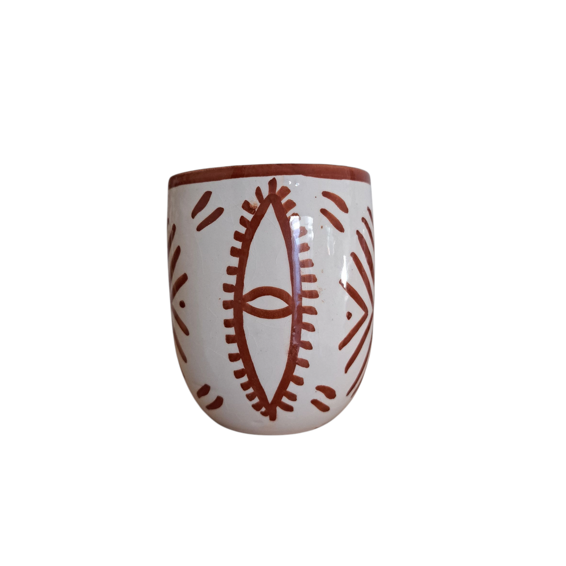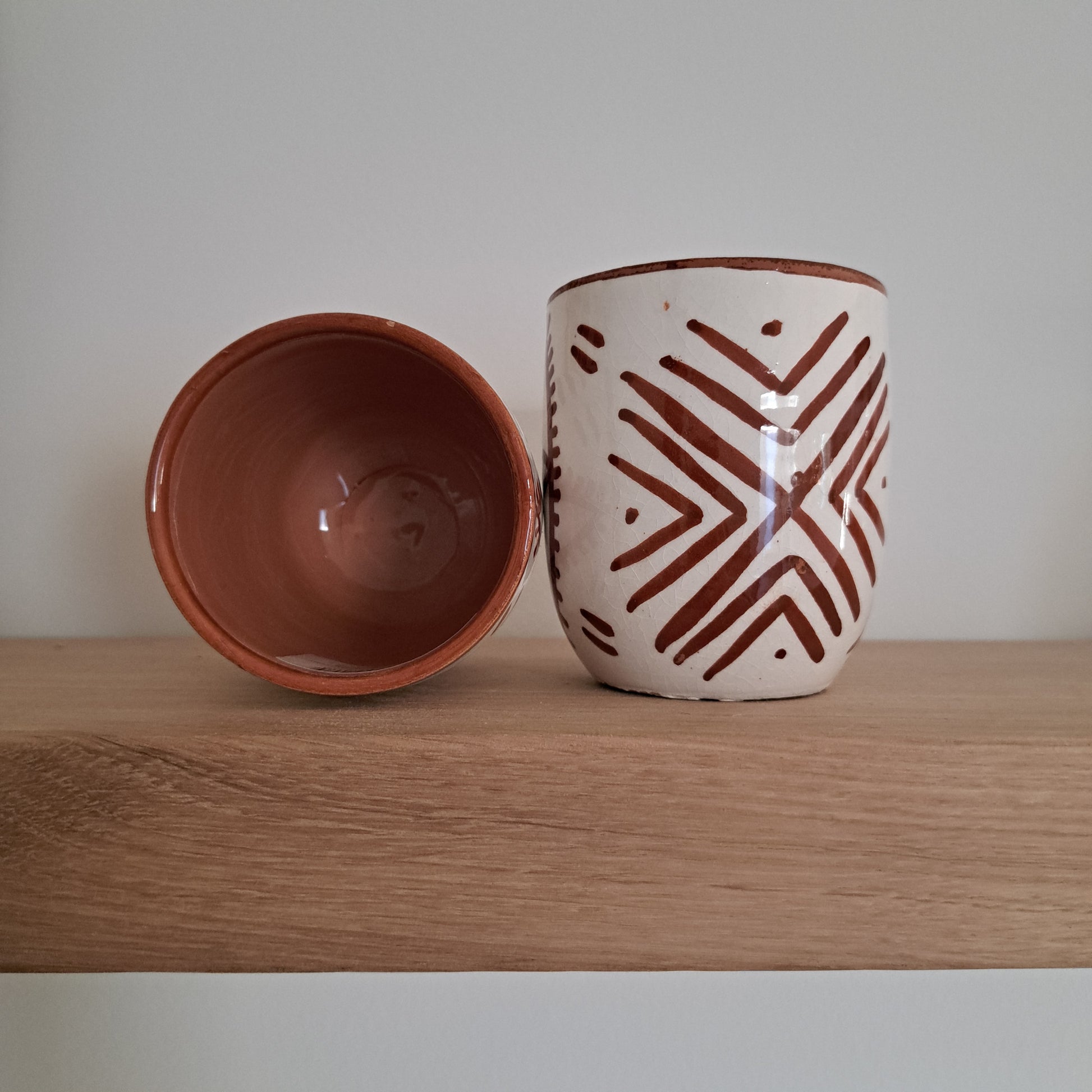Handgemaakte Marokkaanse Keramieken Mok – Oranje-Bruin met Wit (10 cm hoog)