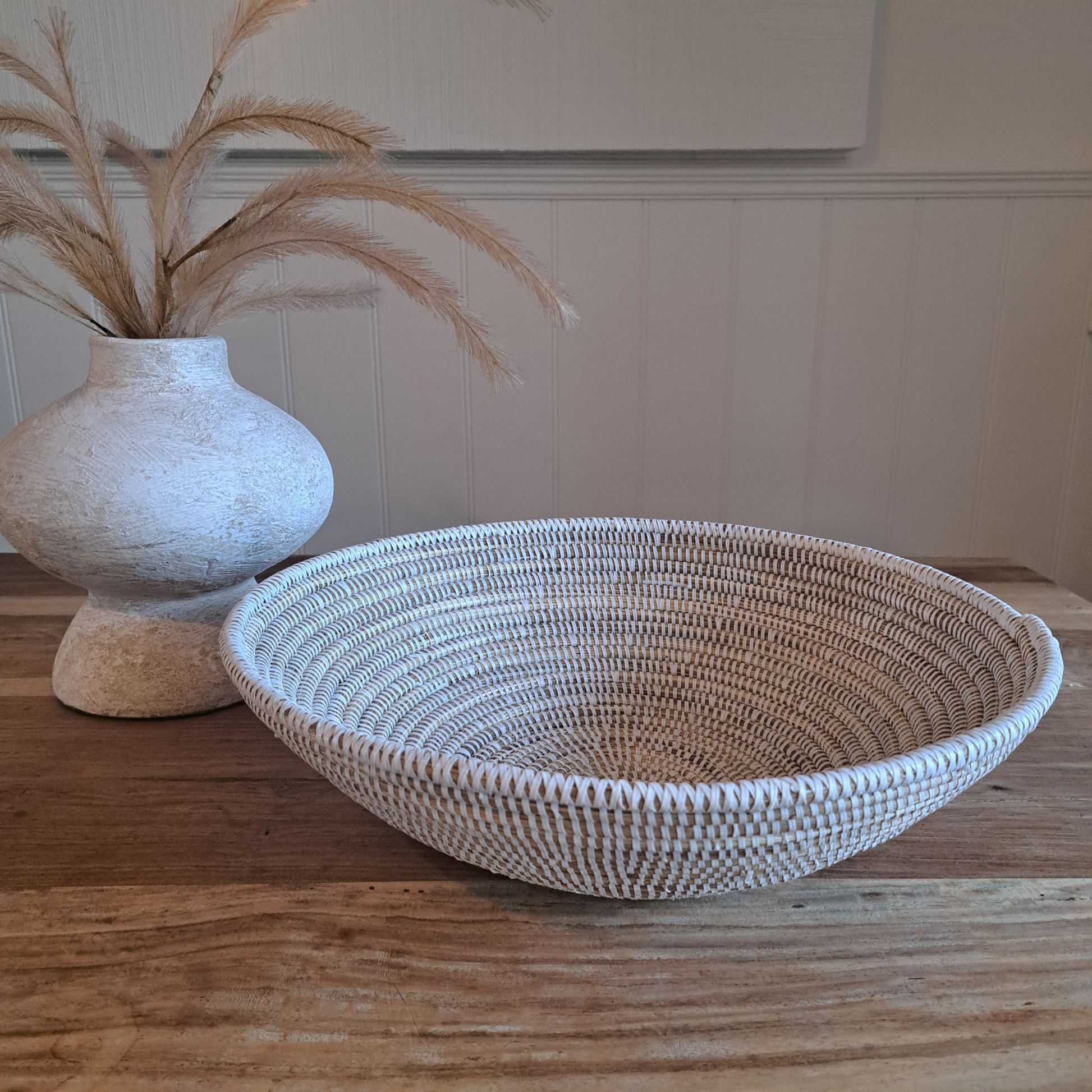 Deze rieten schaal is gemaakt van olifantengras en omwikkeld met wit gerecycled plastic, afkomstig van oude gebedsmatjes. Het subtiele patroon en de natuurlijke tinten maken haar tot een echte blikvanger — perfect in een rustig, warm interieur.