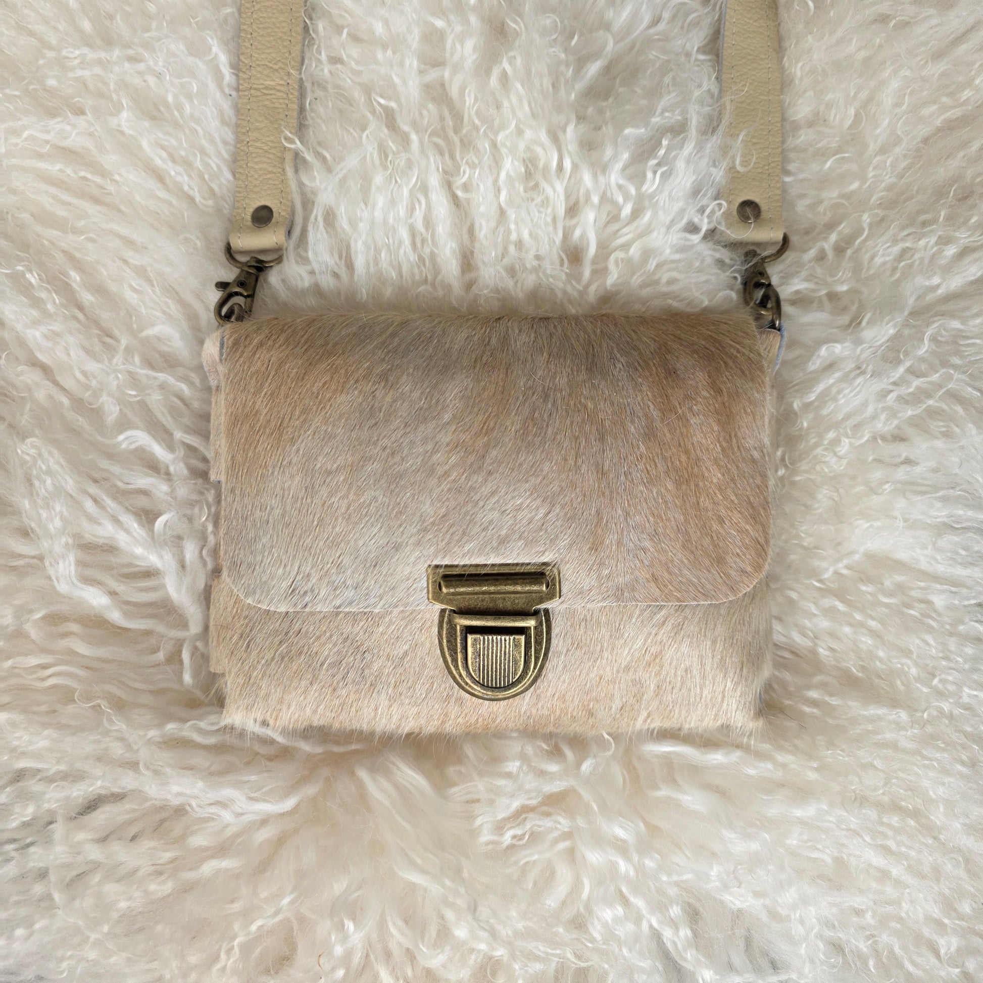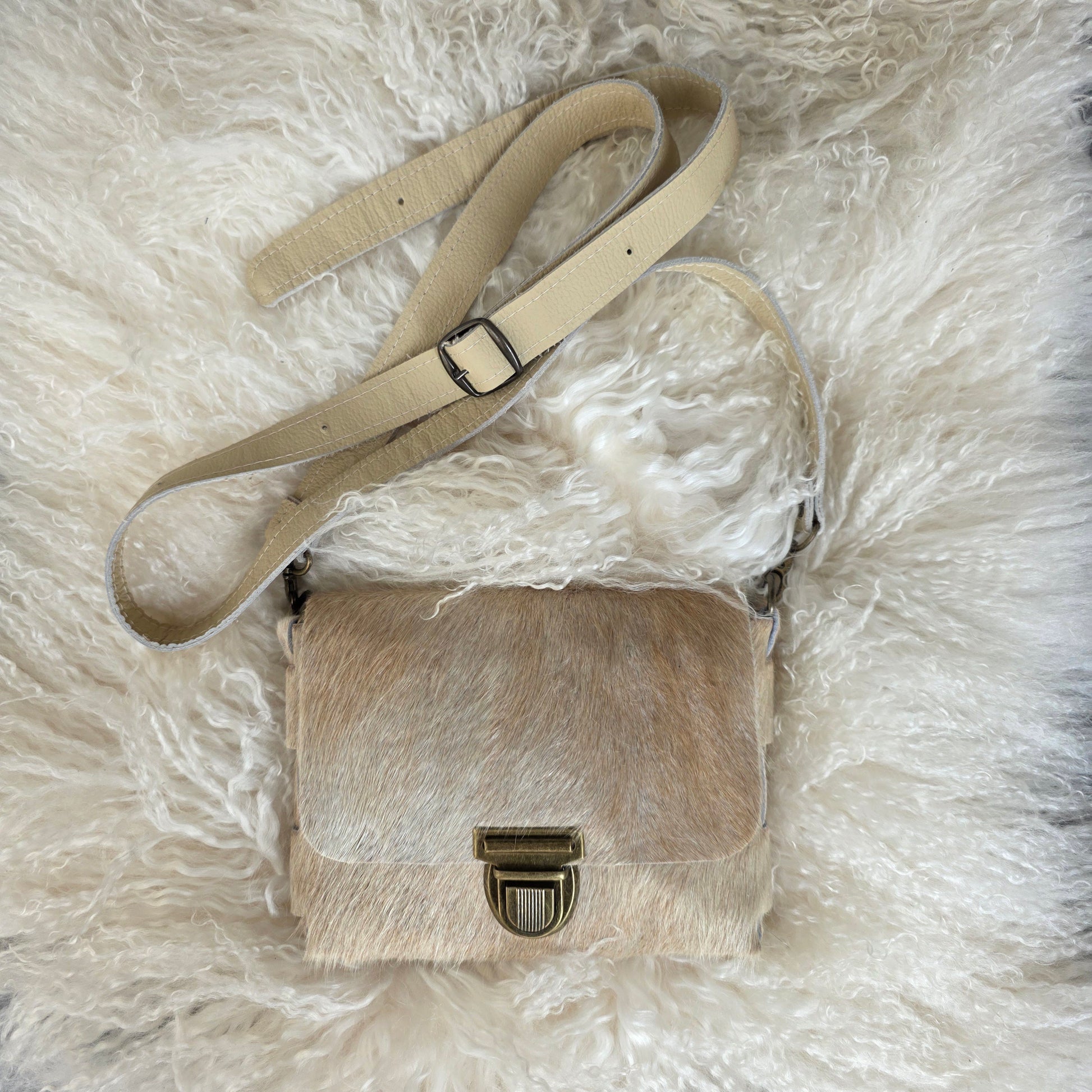 Handgemaakte crossbody tas van koeienvacht