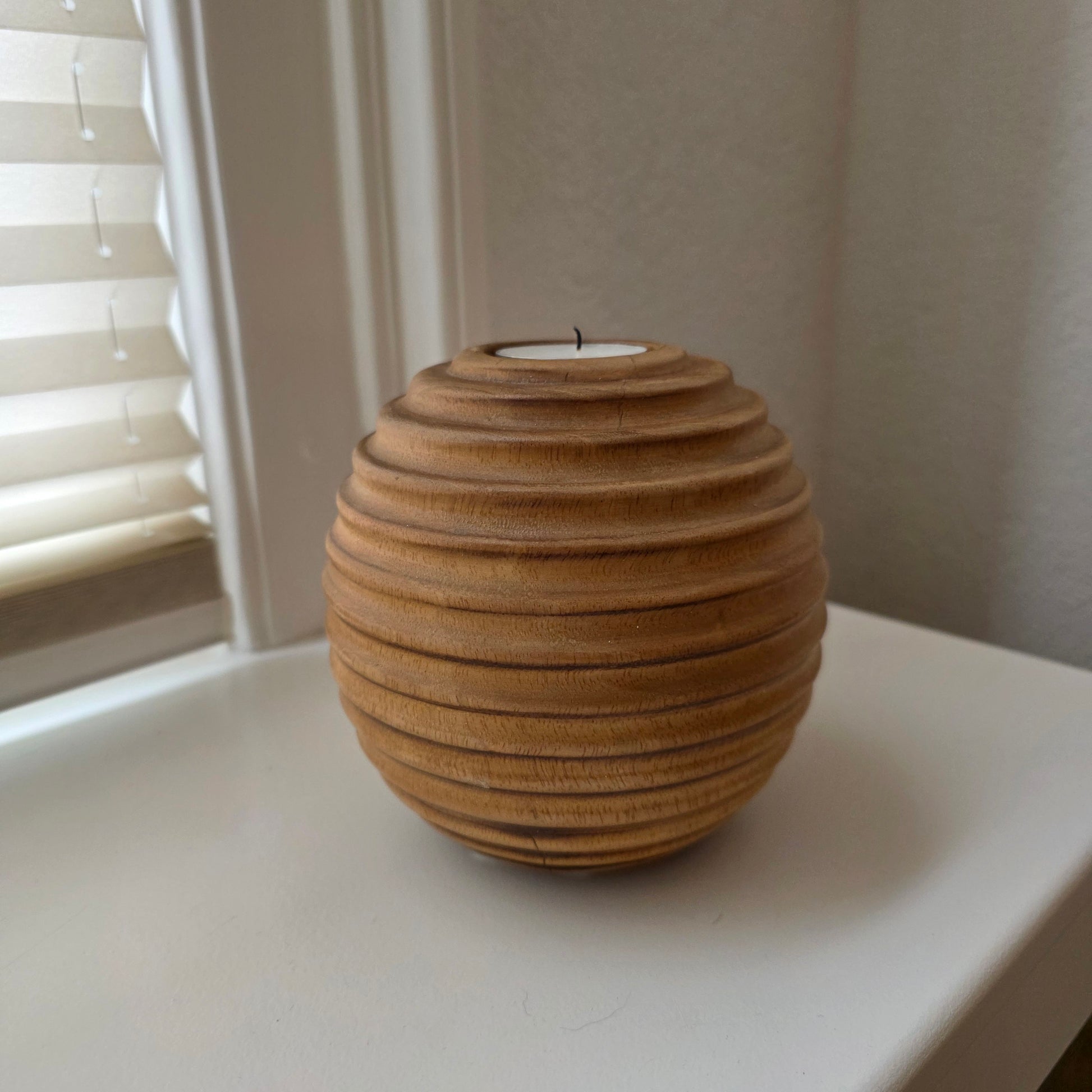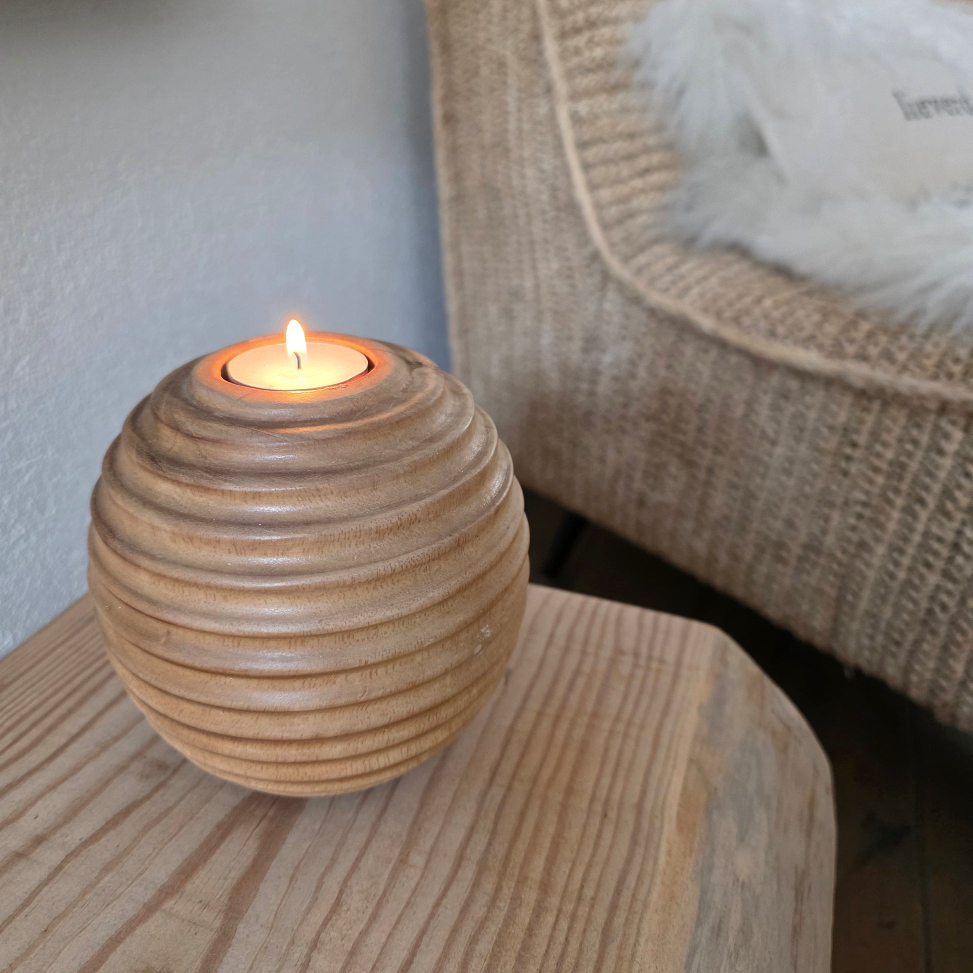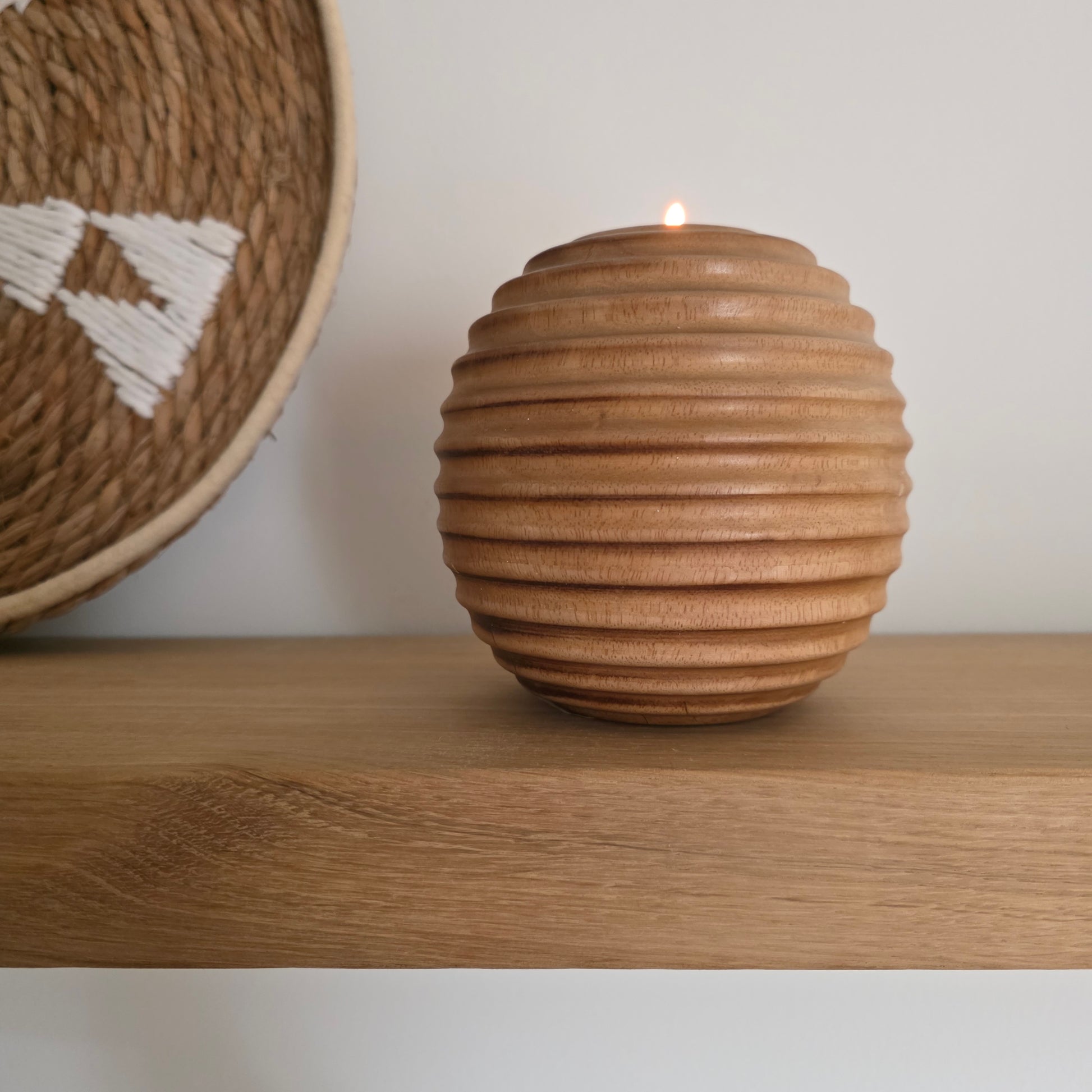 De ronde, geribbelde vorm en warme houtkleur brengen rust in je interieur. Zet haar op een plank, vensterbank of bijzettafel en geniet van het zachte schijnsel dat het hout nog dieper laat gloeien.